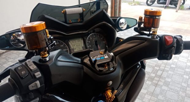 “Mesinnya juga sudah saya upgrade. Cvt juga sudah dinaikkan. Knalpot saya ganti dengan burnout. Tinggal ngacir aja kalo saya touring,” katanya bahwa XMax ini walaupun sudah diubah penampilannya sangat safety.