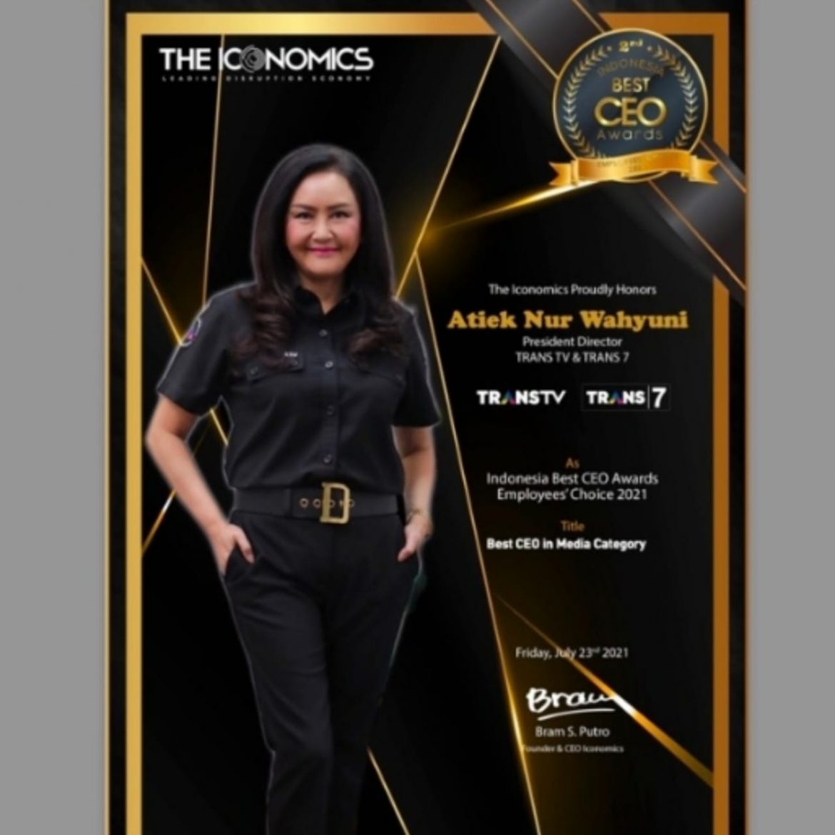 Setelah melakukan penilaian yang dilakukan melalui survey terhadap ribuan staf/karyawan berbagai industri dan kategori dengan total responden mendekati 10.000 serta menilai dari 4 aspek parameter yaitu : Popularity, Competency, Crisis Leadership & Personality. Tim Iconomics Research and Consulting menetapkan Ibu Atiek Nur Wahyuni selaku CEO TRANS TV & TRANS7 sebagai penerima penghargaan “Indonesia Best CEO Awards 2021 ”Employees’ Choice” kategori Media.