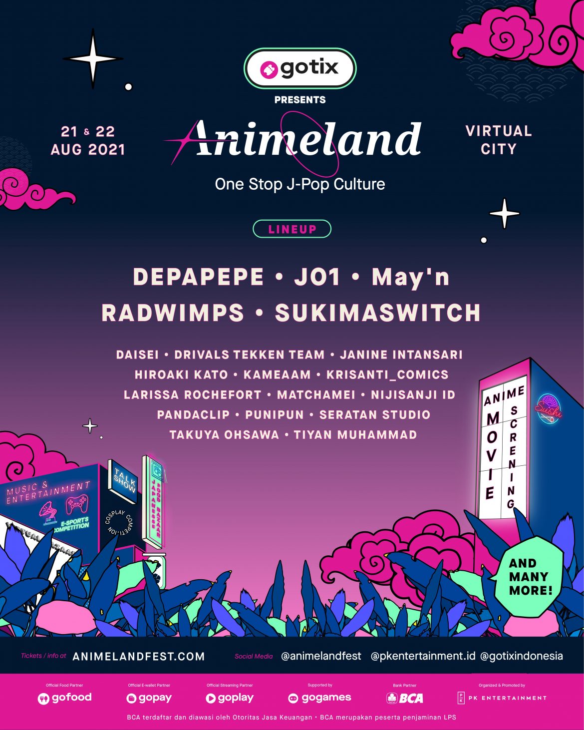 Animeland akan berlangsung secara virtual pada tanggal 21 – 22 Agustus 2021 dan menghadirkan berbagai entertainer dan brand asal Jepang dan Indonesia. Selama dua hari penuh, panggung virtual GoTix Stage akan menghadirkan deretan entertainer Jepang seperti duo akustik DEPAPEPE, duo rock/jazz fusion SUKIMASWITCH, diva lagu anime May’n, grup indie rock RADWIMPS, dan global boyband grup, JO1.