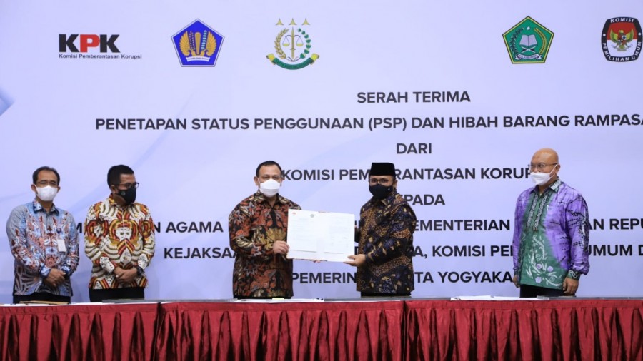 Penyerahan aset senilai Rp6.042.270.000 ini dilakukan secara simbolis oleh Ketua KPK Firli Bahuri kepada Menteri Agama Yaqut Cholil Qoumas, di Gedung KPK, Jakarta.