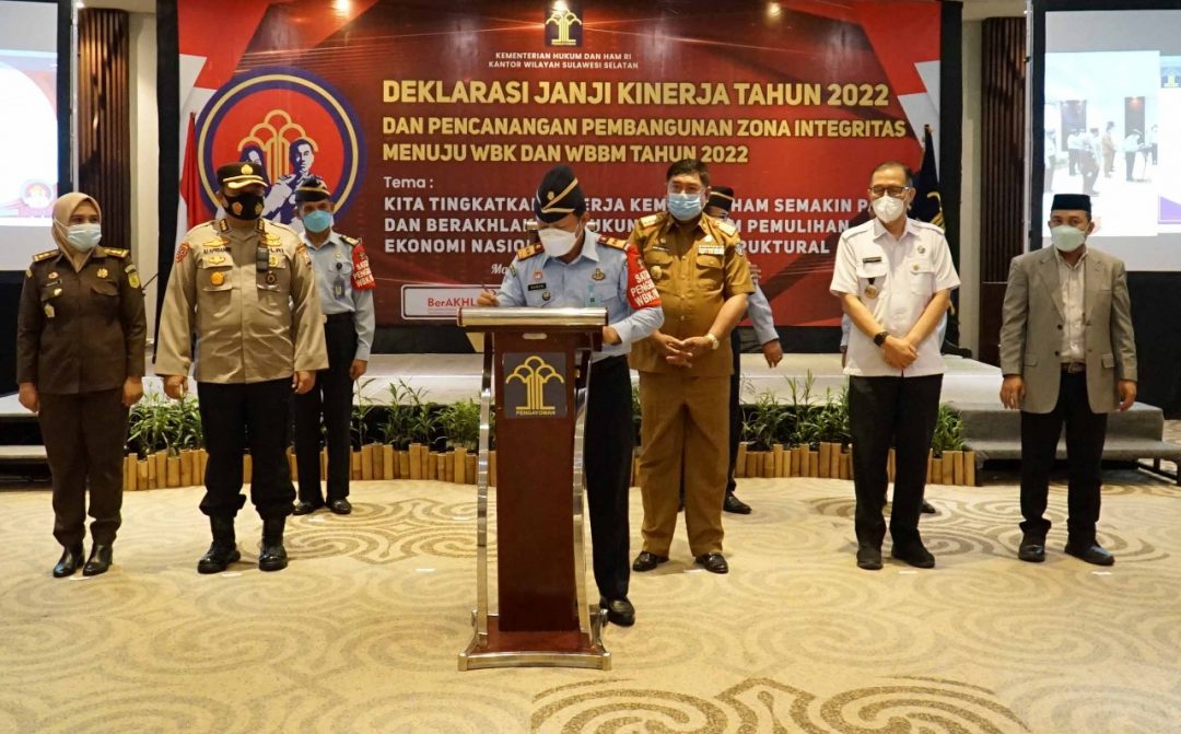 MAKASSAR – Kanwil Kemenkumham Sulsel melaksanakan deklarasikan Janji Kinerja dan Pencanganan Zona Integritas Tahun 2022, Selasa (11/1/22).