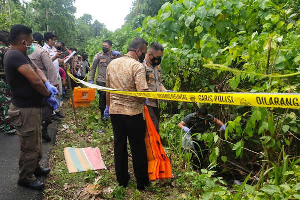 MANADO – Kepolisian melakukan olah TKP penemuan sesosok mayat pria, di selokan tepi jalan antara Desa Kiama dan Desa Tule, Kecamatan Melonguane, Kabupaten Kepulauan Talaud, Kamis (20/1/22).