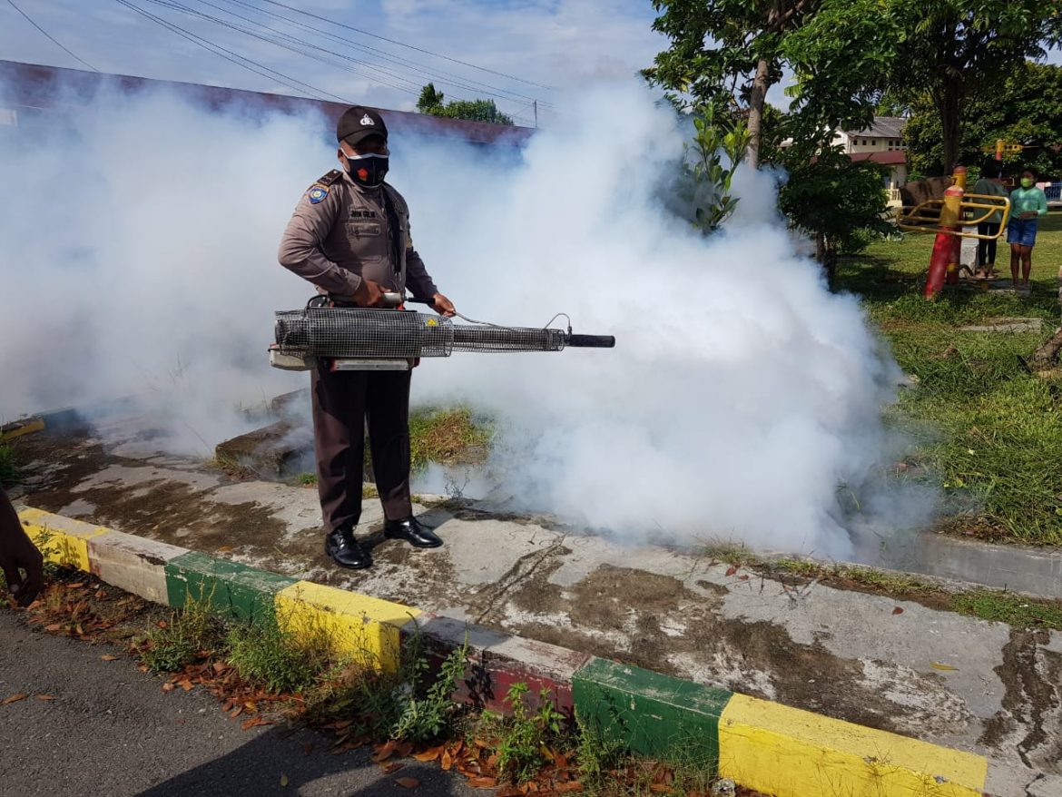 Bhabinkamtibmas Kelurahan Siopat Suhu Aipda Untung JF Nainggolan melakukan langsung foGging di asrama polisi jalan Asahan.