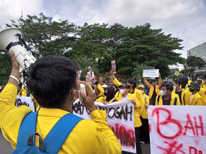 PALEMBANG – Ratusan mahasiswa dari berbagai perguruan tinggi negeri dan swasta di Palembang melakukan aksi unjuk rasa di simpang 5 kantor DPRD Provinsi Sumatera Selatan (Sumsel), Kamis (7/4/22).