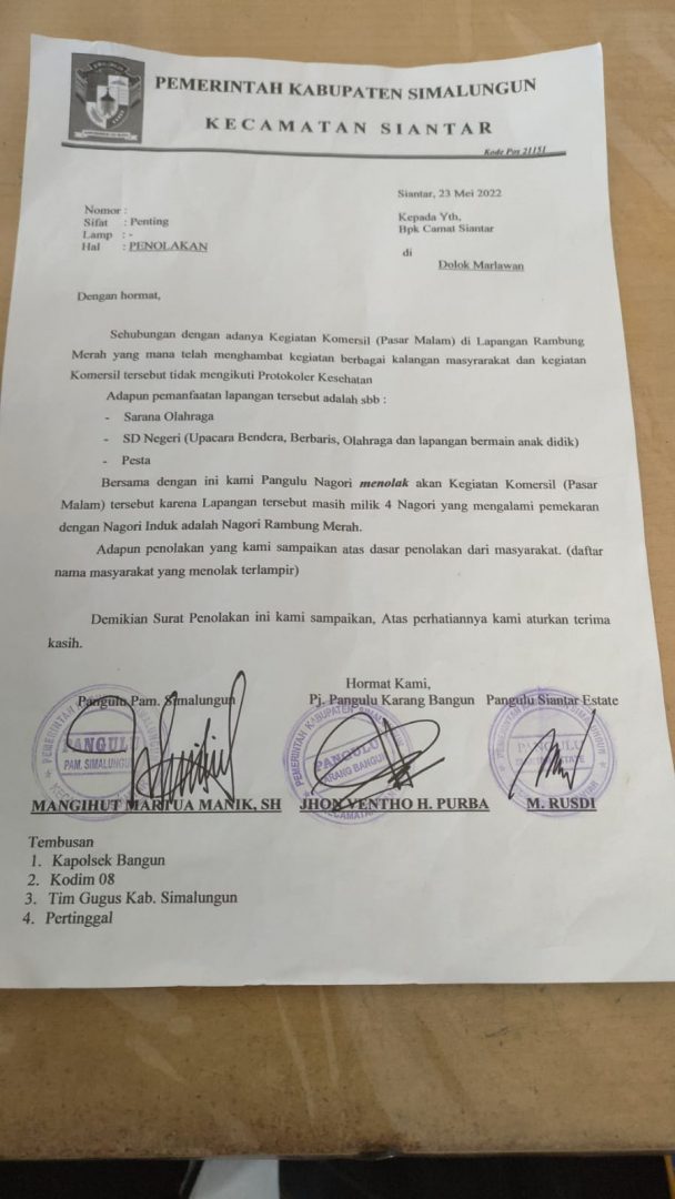 Kades Pamatang Simalungun Mangihut Manik mengatakan, pihaknya sudah menyurati Camat Siantar dan Kapolsek Bangun, tanggal 23 Mei 2022 lalu, terkait permohonan penutupan pasar malam tersebut.