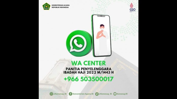 JAKARTA – Kementerian Agama (Kemenag) merilis WA Center atau nomor telepon khusus yang bisa menjadi saluran komunikasi jamaah dan masyarakat terkait penyelenggaraan ibadah haji 1443 H/2022 M.
