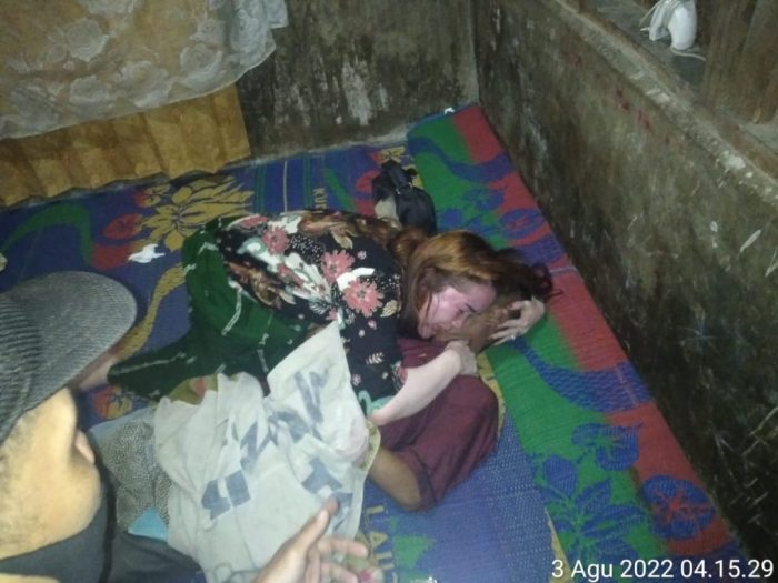 Melihat suaminya tergantung, Meida berupaya menyelamatkan dengan memotong tali yang terikat di leher korban menggunakan pisau.