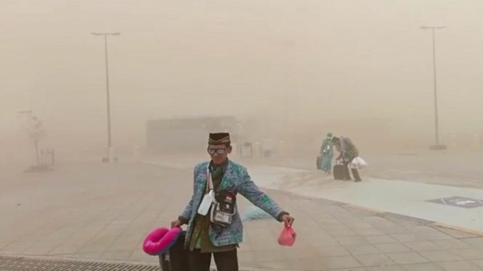 MADINAH – Badai Pasir mewarnai pemulangan jamaah haji Indonesia di Bandara Udara Internasional Pangeran Muhammad bin Abdulaziz, Madinah, Arab Saudi, Minggu (7/8/22).