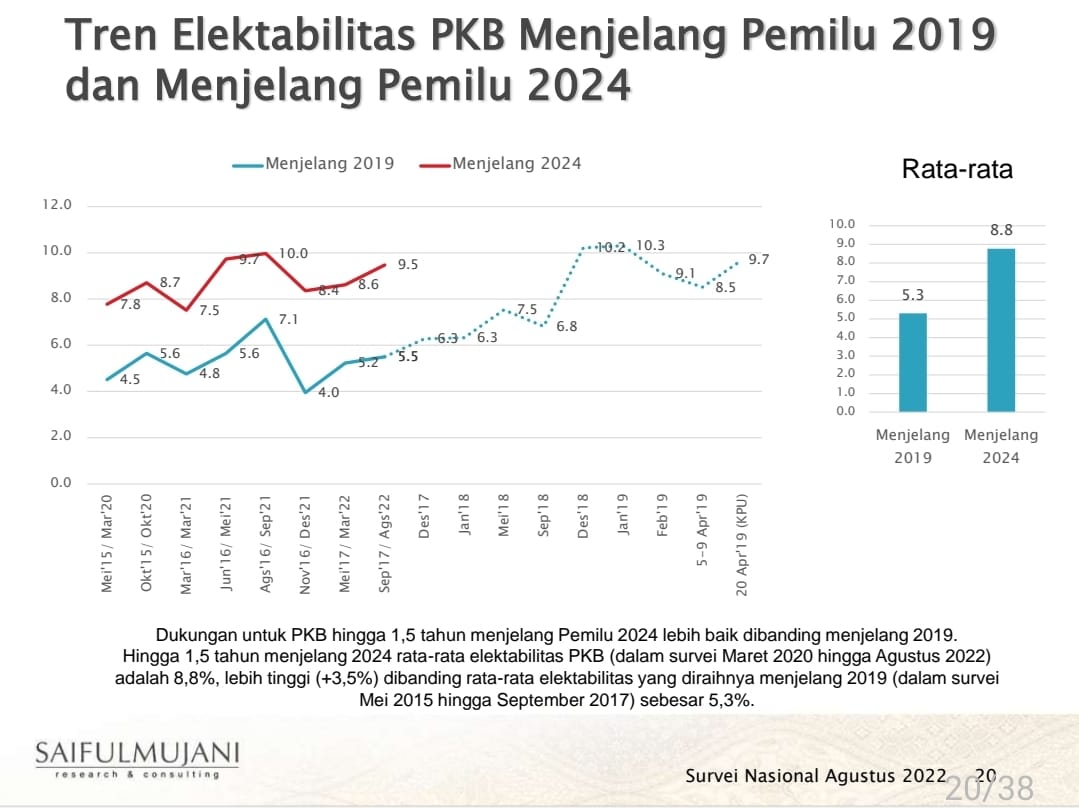 Hingga 1,5 tahun menjelang Pemilu 2024, rata-rata elektabikitas PKB dalam survei Maret 2020 hingga Agustus 2022 adalah 8,8%, lebih tinggi 3,5% dibanding rata-rata elektabilitas yang diraihnya menjelang 2019 dalam survei Mei 2015 hingga September 2017 sebesar 5,3%.