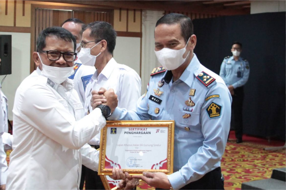 Penghargaan diterima langsung Kepala Lapas Khusus Kelas IIA Gunung Sindur Mujiarto dan Kepala KPLP Fajar, antara lain penghargaan atas capaian Kinerja Pelaksanaan Anggaran Terbaik, Penghargaan atas Unit Pelaksana Teknis Pemasyarakatan Terbaik dalam Bidang Penyelenggaraan Razia dan Penghargaan atas Unit Pelaksana Teknis Pemasyarakatan Terbaik dalam Bidang Penyelenggaraan Pembinaan Jasmani.