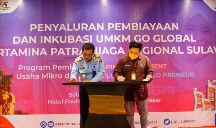 Penandatanganan nota kesepahaman dilaksanakan di Hotel Four Points Makassar, disela pelaksanaan kegiatan Penyaluran Pembiayaan dan Inkubasi UMKM Go Global PT Pertamina Patra Niaga Regional Sulawesi, Selasa (6/12/22).
