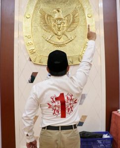Foto kedua gambar dirinya terbalik dengan mengenakan baju warna putih dan di bagian punggungnya tertulis nomor urut 1 sambil mengacungkan jari telunjuk ke atas, membelakangi kamera menghadap logo KPU. “Assalamualaikum. Tetap nomor urut 1. Bismillah..!” ungkapnya.