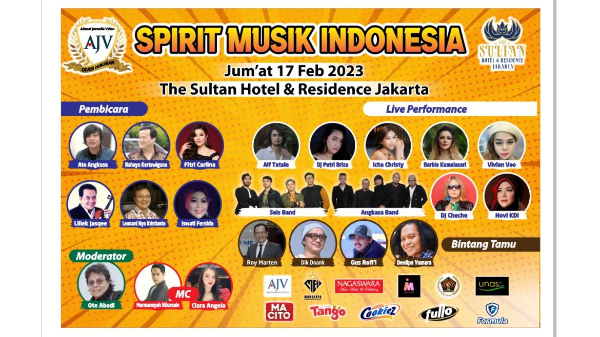 JAKARTA – Jelang Hari Musik Nasional, Aliansi Jurnalis Video (AJV) divisi hiburan menggelar diskusi ‘Spirit Musik Indonesia’ di Hotel Sultan Jakarta, Jumat (17/2/23).