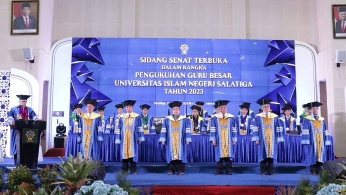 SALATIGA – Universitas Islam Negeri (UIN) Salatiga mengukuhkan enam guru besar baru. Pengukuhan dilakukan dalam Sidang Senat Terbuka oleh Rektor UIN Salatiga Prof. Dr. Zakiyuddin.