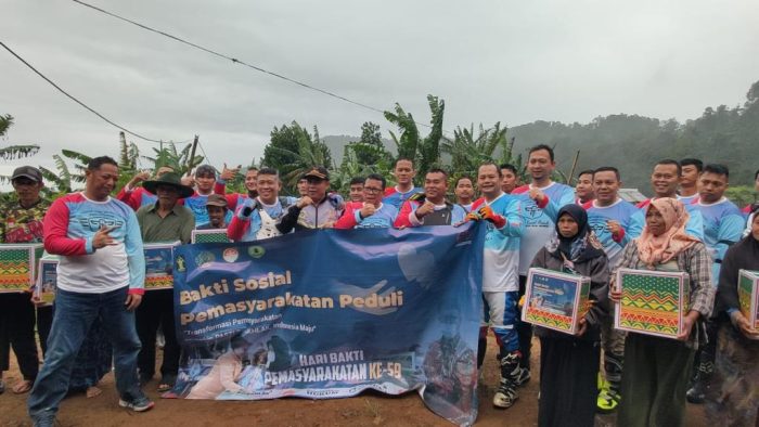 SENTUL – Petugas Pemasyakaratan Ditjenpas dan Unit Pelaksana Teknis Pemasyarakatan (UPT PAS) Jawa Barat menyerahkan bantuan sosial (Bansos) lewat Touring Peduli Hari Bhakti Pemsyarakatan (HBP) ke-59 di Desa Cikadon, Sentul, Jawa Barat, Jumat (14/4/23).