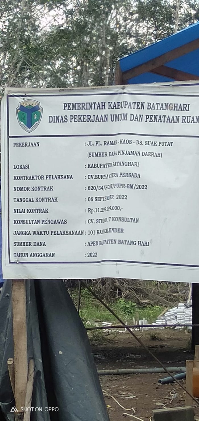 BATANG HARI – Proyek rigit beton Jalan PL Raman-Kaos, Ds Suak Putat, Kecamatan Pemayung Kabupaten Batang Hari, Provinsi Jambi disoal.