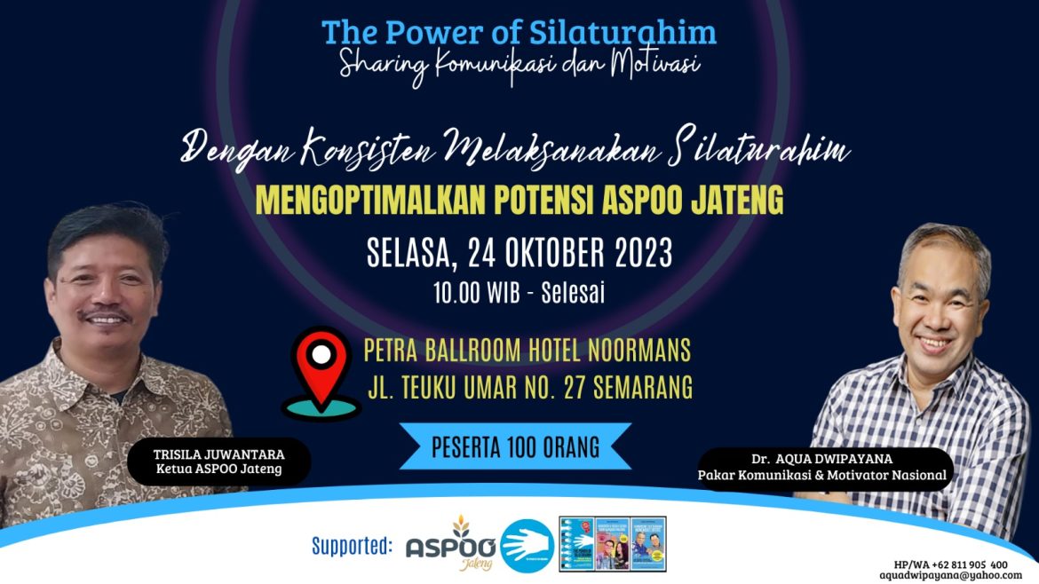 Pakar Komunikasi dan Motivator Nasional Dr Aqua Dwipayana menegaskan hal itu menjelang Sharing Komunikasi dan Motivasi bertajuk “Dengan Konsisten Melaksanakan Silaturahim Mengoptimalkan Potensi Aspoo Jateng”, Selasa (24/10/23).