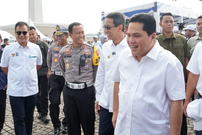JAKARTA – Kakorlantas Polri Irjen Pol Aan Suhanan bersama Menteri Badan Usaha Milik Negara (BUMN) Erick Thohir dan Menteri Perhubungan (Menhub) Budi Karya Sumadi melepas peserta Mudik Asyik BUMN menggunakan bus di Pintu Silang Monumen Nasional Jakarta, Jumat (5/4/24).