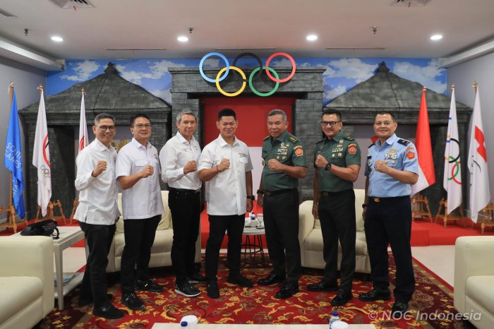JAKARTA – Ketua Umum Komite Olimpiade Indonesia (NOC Indonesia) Raja Sapta Oktohari menerima Pelaksana Tugas (Plt) Gubernur Lembaga Ketahanan Nasional (Lemhannas) RI Letjen TNI Eko Margiyono di International Hall, NOC Indonesia.