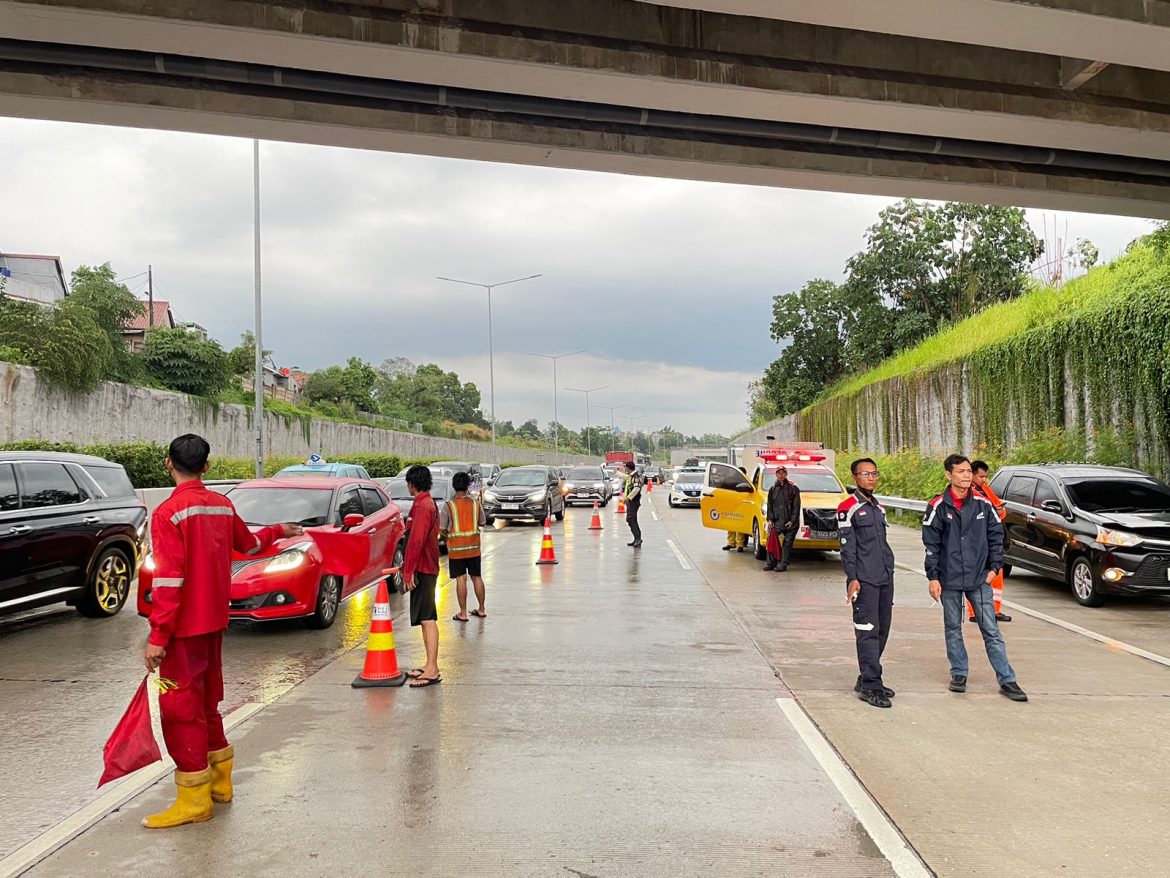 Menanggapi situasi darurat tersebut, Petugas Patroli Jalan Raya (PJR) melakukan pengalihan arus lalu lintas di Gerbang Tol (GT) Limo 1.