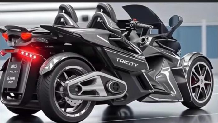 Dua roda depan menciptakan stance lebar yang kokoh, membuatnya tampak seperti sports trike ketimbang skuter kota konvensional.